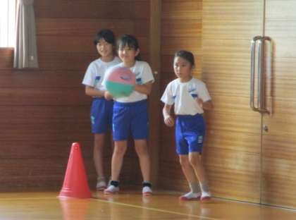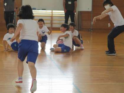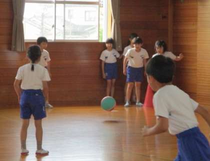 守るチームは飛んだボールをキャッチしたら、みんなで集まって座るというルールです。 守るとき、どこに飛ぶのかをよく見て走るので運動量があります。