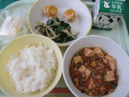 今日の献立は、ごはん、牛乳、マーボ豆腐、ニンジンシューマイ、ナムル、冷凍リンゴです。