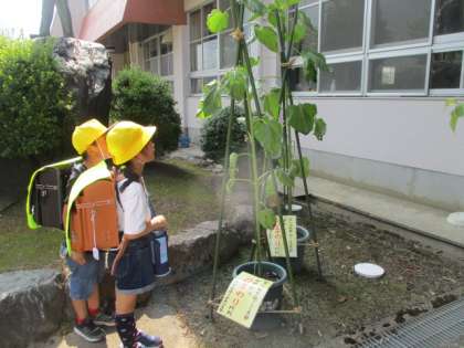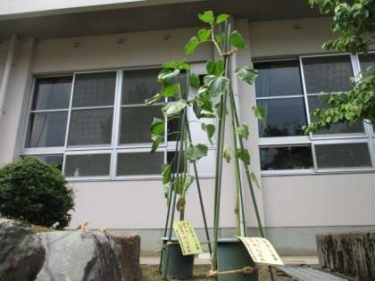早速、支柱を強化して飾りました。今日の下校時には、さっそく子供たちがひまわりを見上げていました。