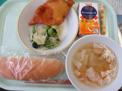 今日の献立は、米粉コッペパン、オレンジジュース、ホキのフリッター、アスパラサラダ、ポテトスープ、棒チーズです。