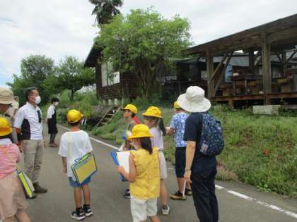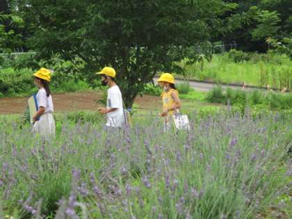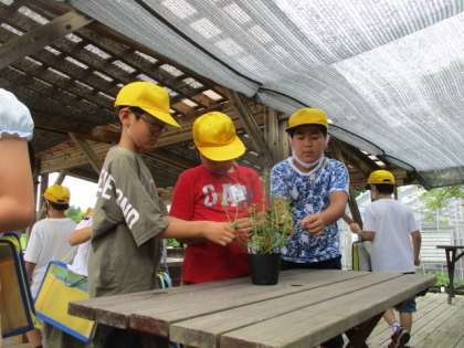 経営者様のご厚意で、甘みがあるハーブの葉を1枚もらいました。フレッシュハーブの香りに感激している子供たちです。