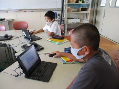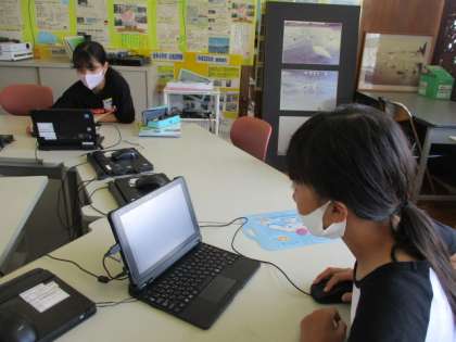 デジタル教科書を使って、水産業の視点から食糧生産について学習を進めています。