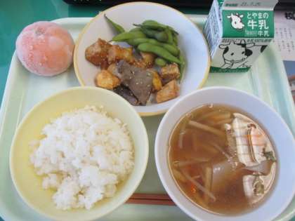 今日の献立は、ごはん、牛乳、高野豆腐とレバーのごまがらめ、枝豆、ワンタンスープ、冷凍ミカンです。