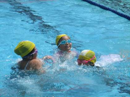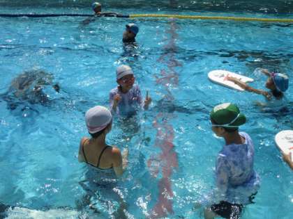 学年の異なる友達と、楽しそうに泳ぐ子供たちです。