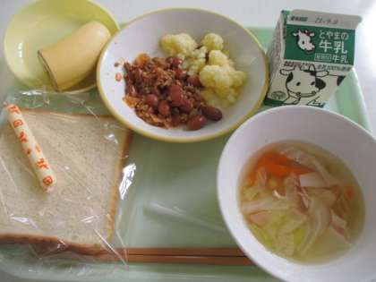 今日の献立は、食パン、牛乳、チリコンカン、こふき芋、野菜スープ、棒チーズ、バナナです。