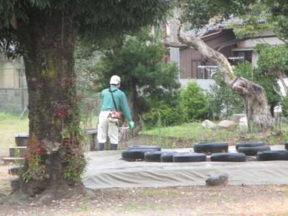 用務員さんの出番です。広い敷地を草刈り機できれいにします。