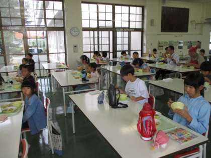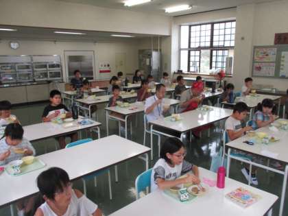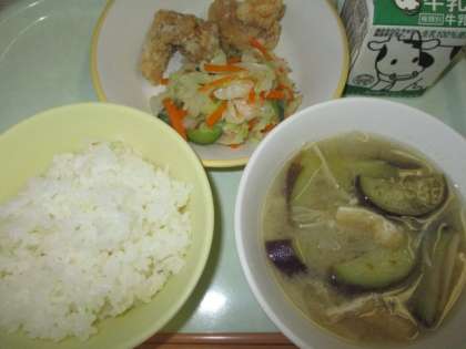 今日の献立は、ごはん、牛乳、鶏肉の米粉揚げ、コールスローサラダ、茄子の味噌汁です。茄子の味噌汁は、茄子、玉ねぎ、エノキ、油揚げが入った実だくさん味噌汁です。