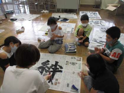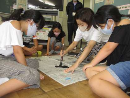 書道の免許をもつ司書の先生にダルマ筆での書道表現を見せてもらいました。