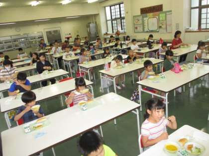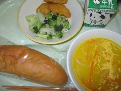 今日の献立は、コッペパン、牛乳、チキンナゲット、フレンチサラダ、かぼちゃポタージュです。