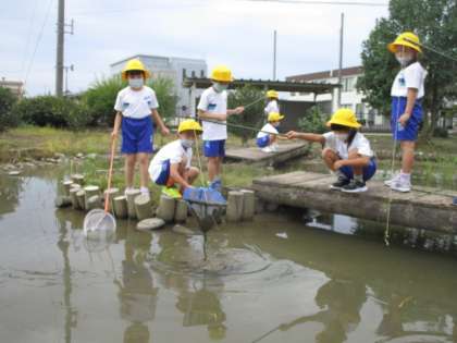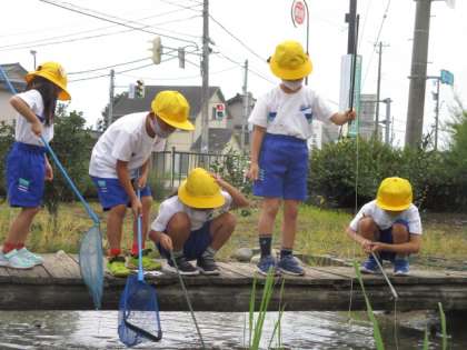 学校の敷地内のビオトープでザリガニ釣りをしました。