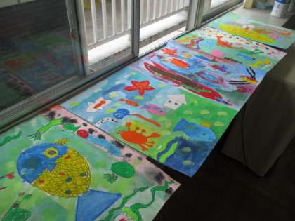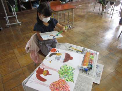 司書の先生に読み聞かせをしてもらったお話の中から自分で選んで、お話の絵を描きました。授業の後半に撮影時したので5人の子供たちが仕上がっています。