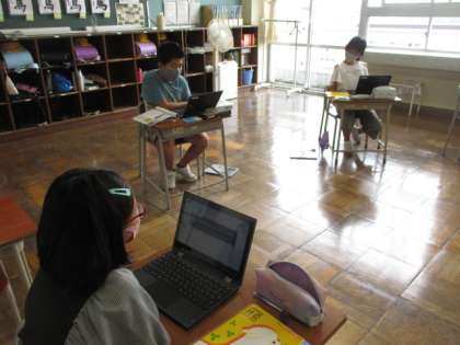 災害時の備えとして、家庭で取り組んでいることについて話し合っています。自宅での備えとして、非常袋の用意、備蓄簡易食やラジオなど、調べて撮影してきたものをもとに話し合っています。