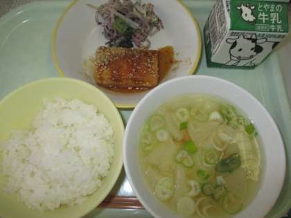 今日の献立は、ごはん、牛乳、揚げ出し豆腐のゴマダレかけ、ゆかり和え、みそ汁です。