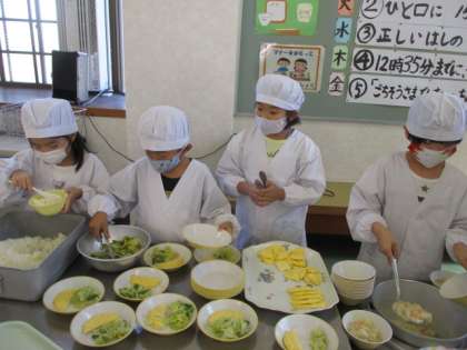 今日の献立は、ごはん、牛乳、オムレツ、アスパラサラダ、白いんげん豆のシチュー、巨峰です。
