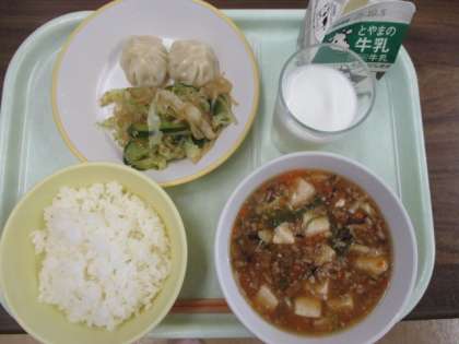 今日の献立は、ごはん、牛乳、マーボ豆腐、エビパオツ、バンサンスーです。
