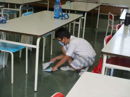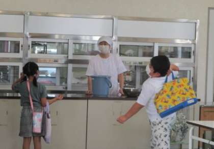 ごちそうさまの後、自分の机の下はきちんと掃除をする池多っ子、調理員さんにお礼を言う池多っ子です。