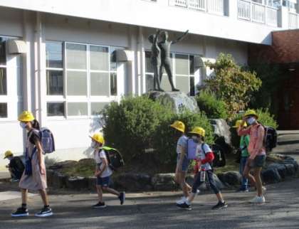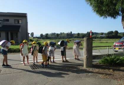 信号のない学校前の横断歩道では、今日も渡り終わると、停車した車に必ずお辞儀をする子供たちです。