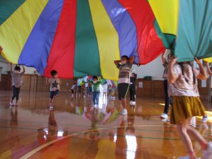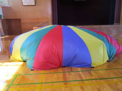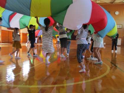 プレイバルーンは、集まって心を合わせて動くことで楽しさが倍増します。声は出さなくても周りの友達の動きに合わせて中心に寄ったり、しゃがみこんだり。ダイナミックな動きを楽しみました。