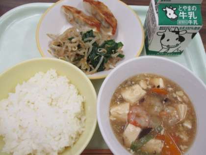 今日の献立は、ごはん、牛乳、エビと豆腐のうま煮、焼き餃子、ナムルです。