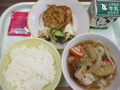 今日の献立は、ごはん、牛乳、かしわうどん、えごま入りかきあげ、昆布和え、しそかつおふりかけです。