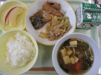 今日の献立は、ごはん、牛乳、きのこじる、さばのみそに、マコモタケのオイスターソースいため、りんごです。