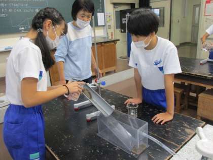 堆積によって地層ができる仕組みについて学習しています。実験をして確かめています。