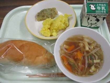 今日の献立は、米粉コッペパン、牛乳、タラの香草焼き、チーズおさつ、春雨スープです。