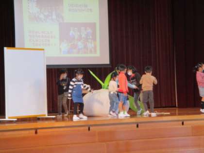 舞台に「大きなかぶ」が登場しました。練習に熱が入ります。