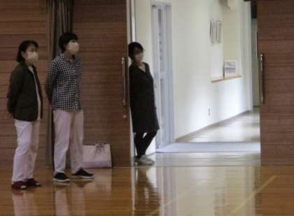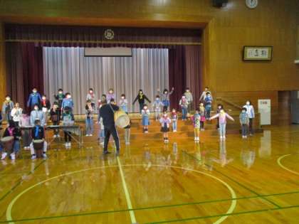 体育館で合奏の練習をしていると、調理員さんや助手さんが音色に惹かれて見に来てくれました。パワフルな合奏を学習発表会で披露します。