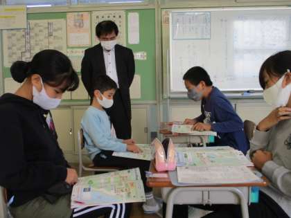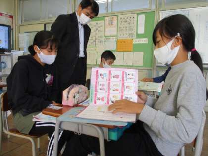英語での質問と答えをペアで言い合っています。言葉がすぐに思い浮かばないときは、テキストを見直して復習しながら進めていました。