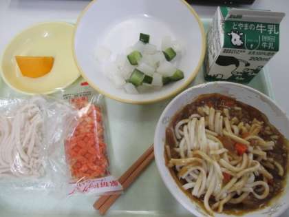 今日の献立は、ソフト麺カレーソース、牛乳、チーズドッグ、コロコロサラダ、柿です。