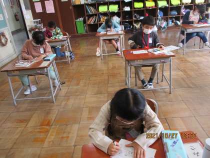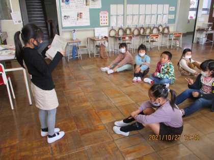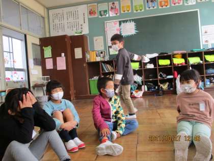 わくわくタイムに、ゲーム係さんが「はんかちおとし」を計画してくれました。喜んでもらえるようにと、メダルも用意しました。その後には、ぬりえ係さんが用意した「手作りハロウィンぬりえ」が配られました。楽しい絵に歓声があがり、みんなでぬりえもしました。