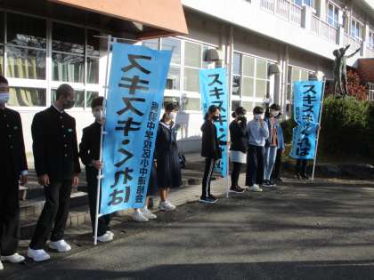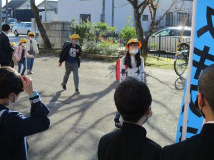 中学生が応援に来てくれ、あいさつ運動を行いました。晴天のもと、さわやかなあいさつが響きました。
