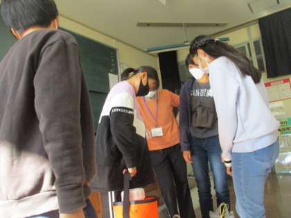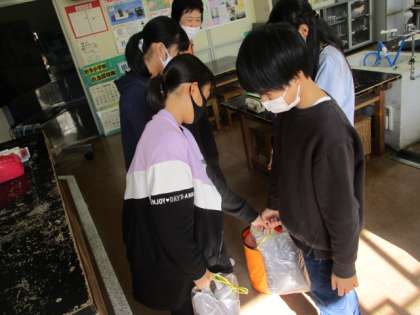「てこの働き」の学習にあたり、まずおもりを持ってみて重量を実感しています。