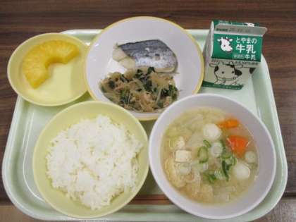 今日の献立は、ごはん、牛乳、鰆の塩焼き、白滝のピリ辛炒め、白玉汁、カットパインです。