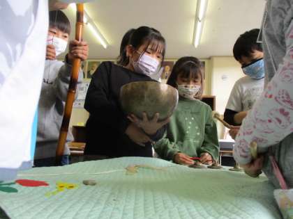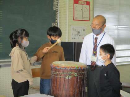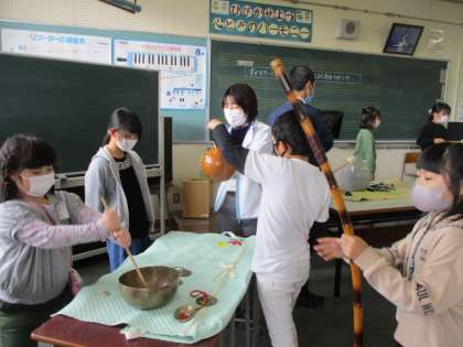 音が出るとき、ものが震えていることに気づいた子供たち。今日は、音の大きさによって震え方がちがうのかについて、いろいろな楽器を鳴らしてみて考えました。