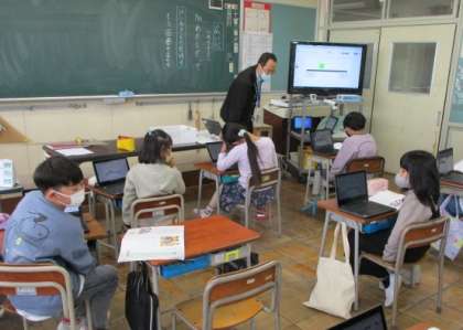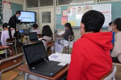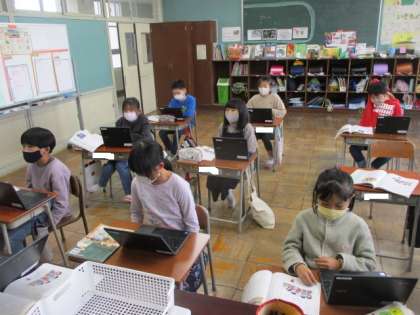 資料を読み、自分はどちらの立場に近いかをクロームブックで表現しながら話し合いを進めています。