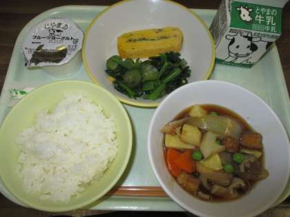 今日の献立は、ごはん、牛乳、シイラの黒酢あんかけ、えごま入り卵焼き、小松菜サラダ、ラフランスヨーグルトてす。
