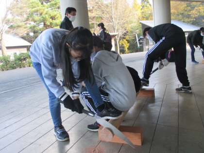 丸太をのこぎりで切って、やすりで削り、焼き印を押して自分だけの素敵なコースターを作りました。慣れないのこぎりに戸惑いながらも、真剣に作る様子が印象的でした。