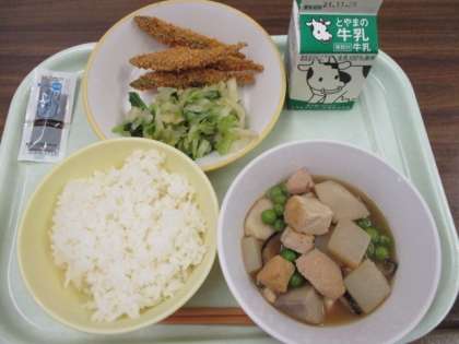 今日の献立は、ごはん、牛乳、里芋と厚揚げのうま煮、きびなごのサクサク揚げ、梅肉和え、のり佃煮です。