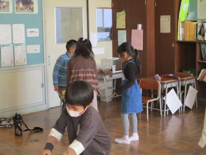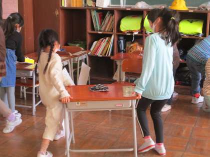 自分たちで考えて、行動できる1年生です。給食に行く前に、自分たちで力を合わせて、掃除のために、机を教室の後ろに移動しています。「うんとこしょ、どっこいしょ。」と、かけ声が教室に響きます。