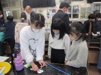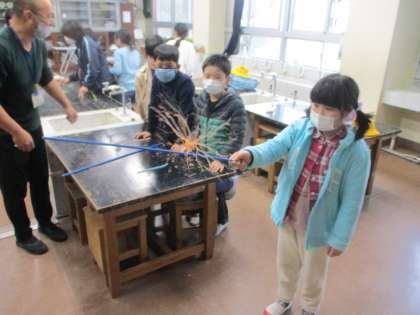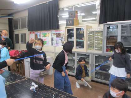 科学・手作りクラブでは、静電気の実験をしました。3年生も上級生に教えてもらいながら体験しています。「すごいね」「楽しい」という声がたくさん聞こえてきました。