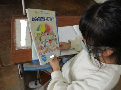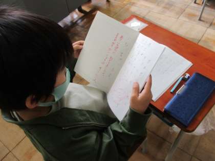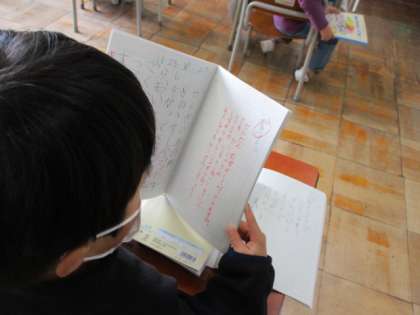 そっと開いて、先生の書いた文章を嬉しそうに読む一年生です。表紙には、頑張りシールがたまってきました。これもうれしいですね。