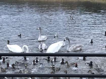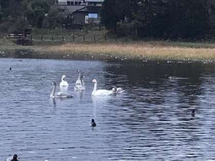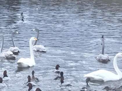 田尻池に、いよいよ白鳥がやってきました。 写真は、朝7時9分ごろの様子です。