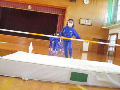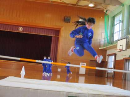 強く踏み切ってバーを跳び越すことに慣れ、しっかり着地しています。