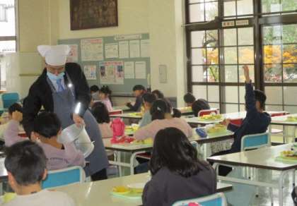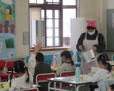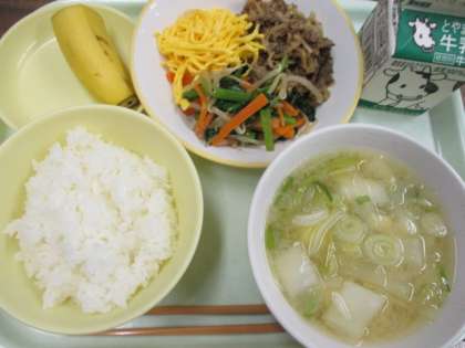今日の献立は、ごはん、牛乳、ビビンバ焼肉、ナムル、錦糸卵、みそ汁、バナナです。