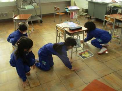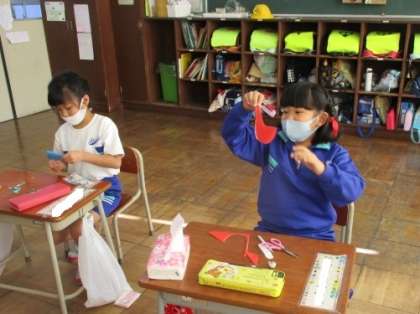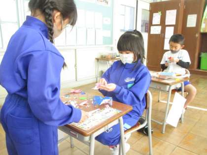 一年生は折り紙を切って模様づくりをしています。2年生は「どうぶつごっこ」だそうです。