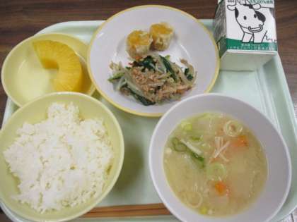 今日の献立は、ごはん、牛乳、ニンジンシュウマイ、スタミナ納豆、具沢山汁、カットパインです。