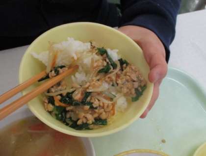 スタミナ納豆とは、どのようなものか期待していました。納豆とニラやもやしの和えものでした。子供たちの中には、「スタミナ納豆どんぶり」にしている子供もいました。