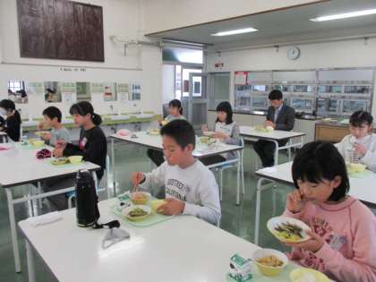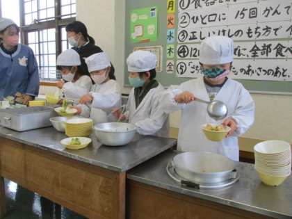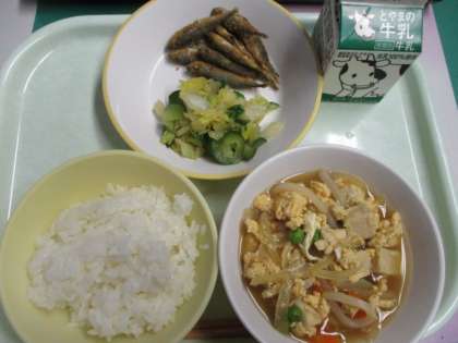 今日の献立は、ごはん、牛乳、親子煮、コアジのから揚げ、白菜浸しです。